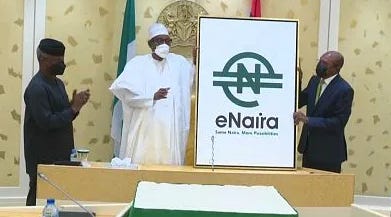 The Central Bank of Nigeria is also responsible for launching the first African central bank digital currency, quite a test run for the banking and oil cartels. Denominated in naira, the eNaira serves as both a medium of exchange and a store of value and claims to offer better payment prospects in retail transactions when compared to cash. The eNaira was launched and activated on 25 October 2021 by President Muhammad Buhari, under the slogan: "Same Naira, More Possibilities".