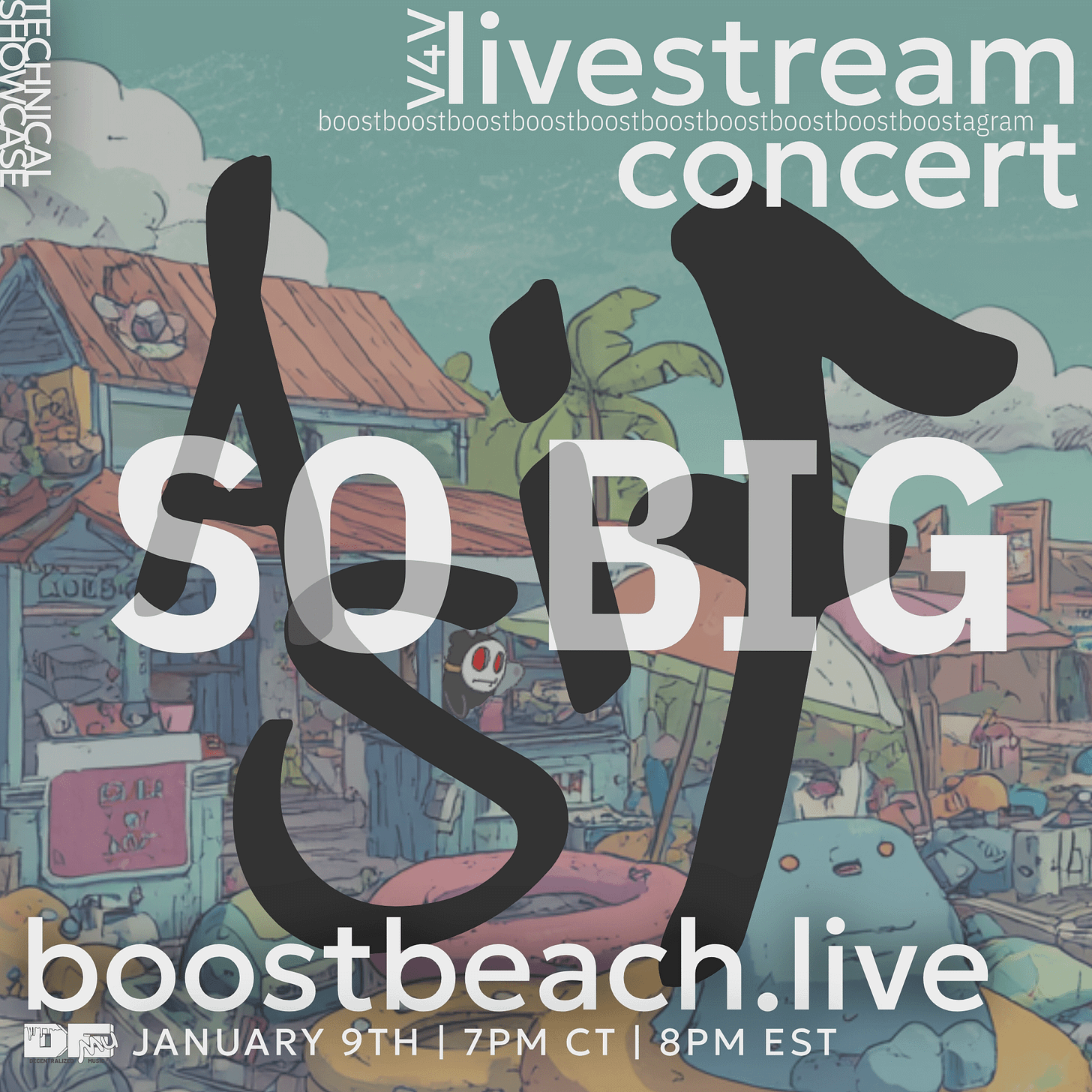 So Big performs right on Boost Beach, as you boost or zap thru a modern podcast app, watch the surrounding set of inflatables glow to life. Colors wash over the stage while a full crew brings to life a V4V Showcase spectacle like no other. You, the producers at home, work together to fill the “HYPER BOOST BAR”! Fill ‘er up and see the bubbles fly! Wave high to Judy the “Inflatable Friend” and take a visual stroll through the inflatable palm tree jungle with vintage Sony Handycams!